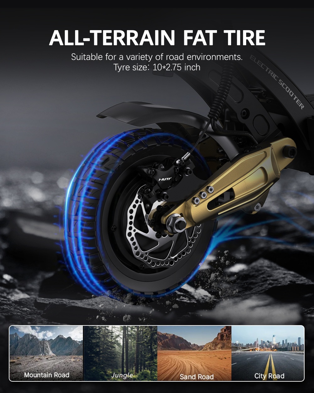 10-inch all-terrain tires, stronger bearing capacity, better shock absorption effect, stronger grip, safe and comfortable driving. Adapt to all kinds of pavement. great shock absorption and anti-slip treads.