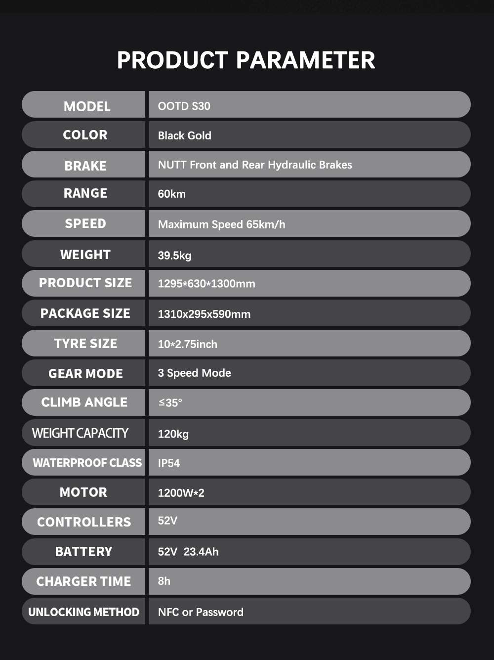 OOTD S30 electric scooter is equipped with powerful 1200W dual motors, ensuring smooth and efficient journeys whether you're navigating through crowded streets or cruising along spacious roads.